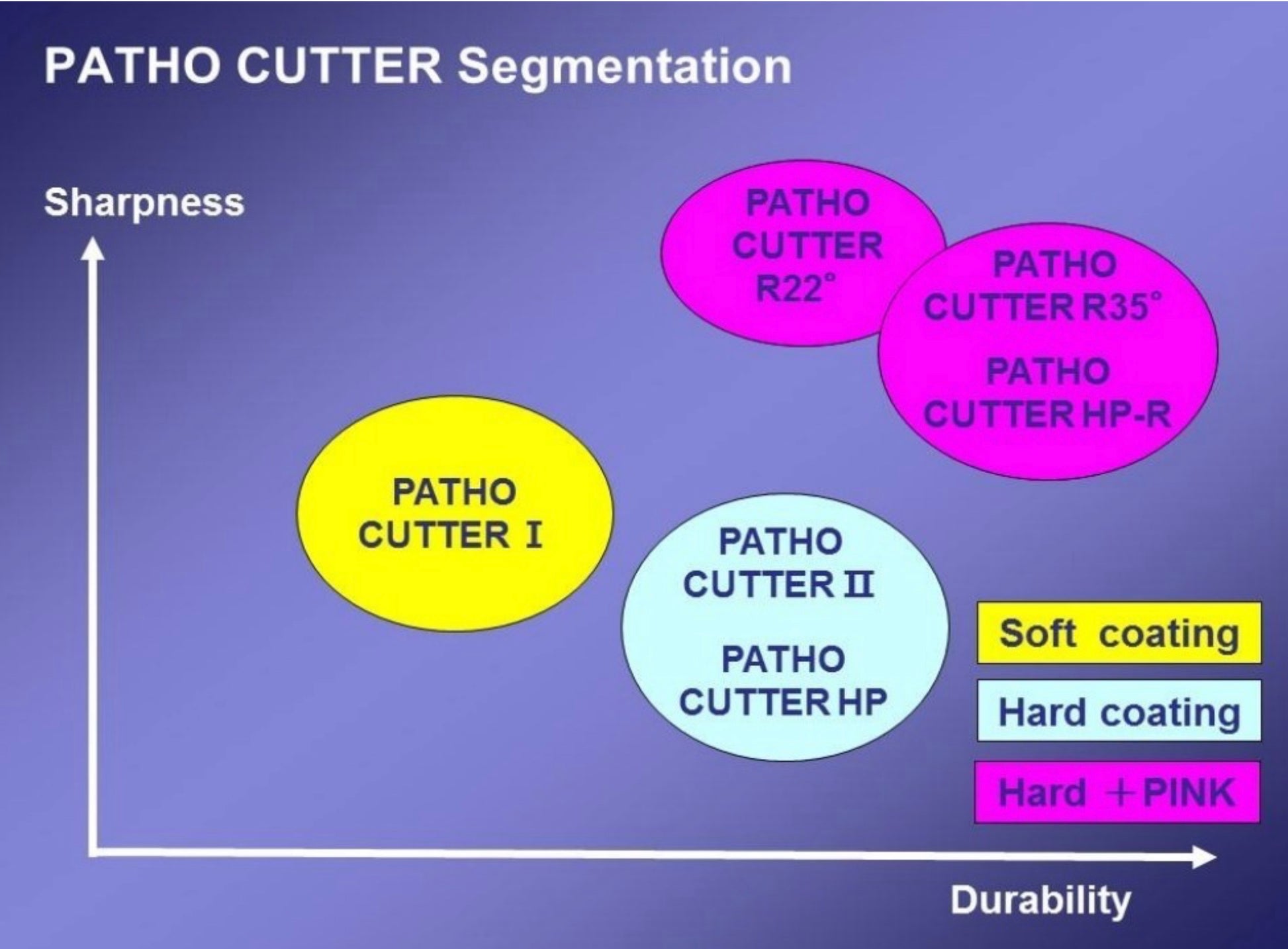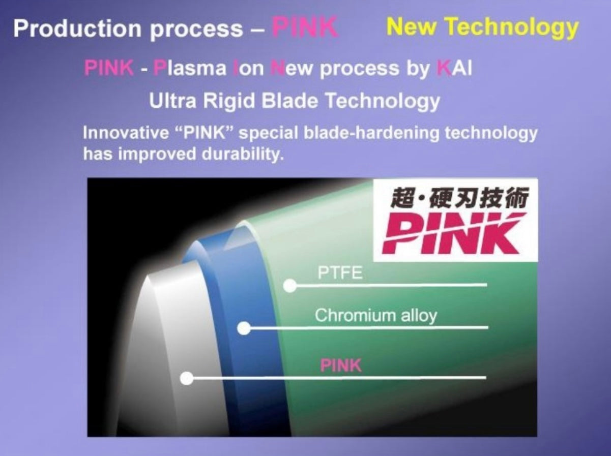 La durabilidad se incrementó con la tecnología única "PINK", Plasma Ion New Process de Kai, como la dureza del filo de la hoja se mejoró en aproximadamente un 70%. La tecnología PINK propia de Kai, que prioriza tanto la nitidez como la durabilidad, se ha aplicado a los bordes de las hojas de Patho-Cutter.