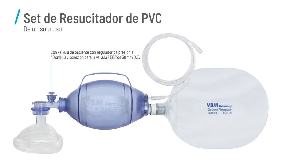 Consta de: bolsa de reanimación de PVC (válvula de presión de 40 cmH2O) y mascarilla, bolsa de depósito, tubo de O2 de 200 cm y adaptador de PEEP.